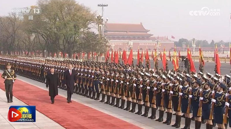 費利佩六世抵達時,禮兵列隊致敬。習近平同費利佩六世登上檢閱臺,軍樂團奏中西兩國國歌,天安門廣場鳴放禮炮21響。費利佩六世在習近平陪同下檢閱中國人民解放軍儀仗隊,并觀看分列式。